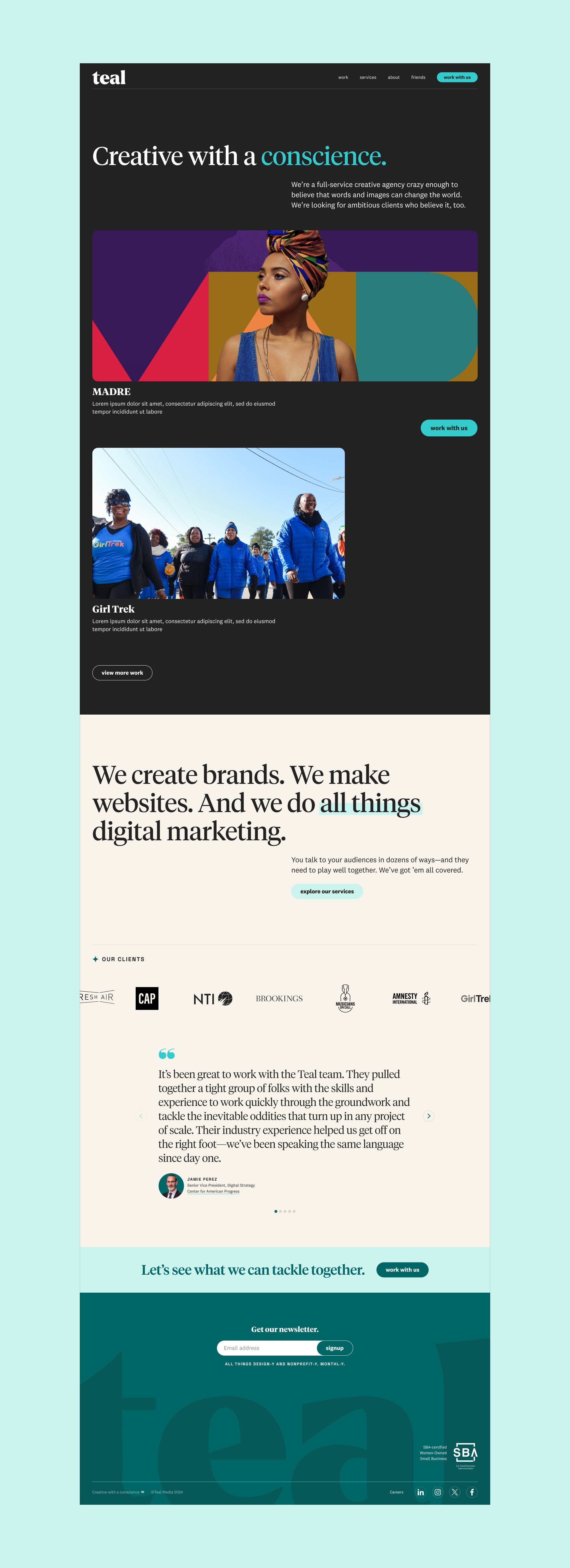After 15 years in business, Teal Media—a woman-founded, women-led creative agency partnering with nonprofits on brands, websites, and digital marketing—had outgrown its visual identity. The agency’s expertise, sophistication, and client roster had evolved significantly, but the brand hadn’t kept pace. The rebrand needed to honestly reflect who Teal had become: a trusted strategic partner to some of the most consequential mission-driven organizations in the country.